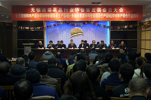 12月4日上午,无锡蔬菜果品行业协会第五届会员大会暨朝阳农产品大市场与全国蔬果生产基地、天惠超市与无锡蔬菜生产基地2018年产销合作签约大会在朝阳农产品大市场召开。无锡蔬菜果品行业协会会员、全国及无锡蔬果生产基地代表、蔬果行业各单位、各部门有关人员共200余人出席会议。无锡市政协副秘书长、无锡市工商联副主席王海宝、无锡市民政局副调研员刘长风等领导出席会议。无锡日报、江南晚报、无锡广播电视台等主流媒体记者到会采访。