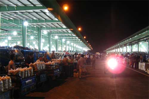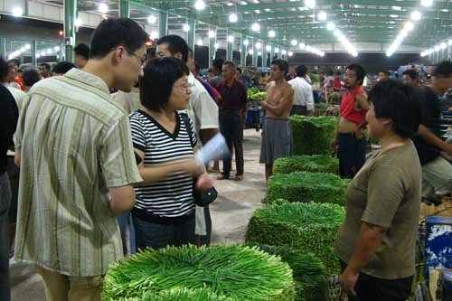 昨晚11点左右,忙碌了一天的城市逐渐告别喧嚣进入梦乡,而位于黄巷北滨路的朝阳蔬菜批发新市场则是另一番洞天。记者驱车进入市场时,庞大的停车场已经停放了数十辆大货车,门外还有大货车不断涌入。远远向交易区看去,一盏盏晶莹剔透的吊灯将三个绿色大棚照得如同白昼。交易区内,货车一字排开,经营户们开始忙碌地将车上的各类蔬菜卸在地上并整齐地堆放好。渐渐地,货车越来越多,小商小贩的电瓶车也随之不断涌入。由于交易市场有一个主通道,四个副通道,形成车辆内部环形圈,所以现场井然有序,并没有出现拥堵情况。