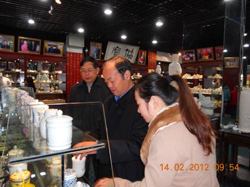 在集团董事长张海良先生、总经理杨兴德先生的陪同下,傅会长和王秘书长兴致勃勃的参观了无锡文化工艺品市场,先后在中国陶都陶瓷国际博览中心无锡艺术馆、国家级非物质文化遗产南京吉祥云锦等展馆欣赏了众多国家级工艺美术大师们的艺术珍品,对展馆内精雕细刻、美轮美奂的工艺展品赞不绝口,对朝阳集团大胆涉足文化产业、繁荣文化市场的创举表示认同和赞许。