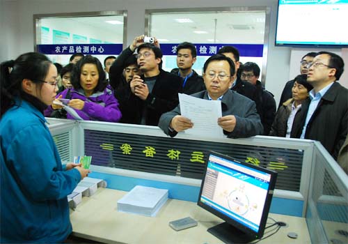 在位于无锡朝阳农产品大市场的蔬菜备案中心,常司长一行仔细查验了蔬菜经营者注册备案流程。完美入口总经理杨兴德向督查组汇报了完美入口依托农产品大市场,并结合本溯源项目,投入大量的人力、资金,切实开展农产品电子化交易结算,认真实施农贸市场溯源节点管理,在批发市场、农贸市场、连锁超市农产品追溯等方面均取得了显著的成效。