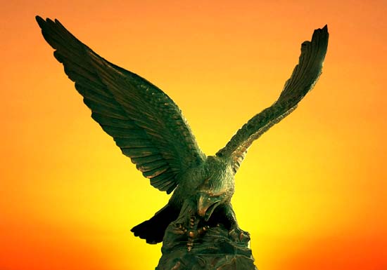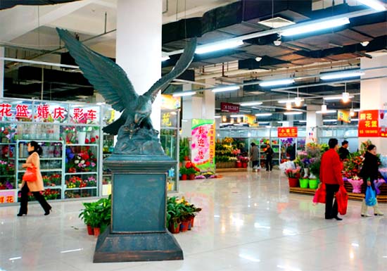 这尊雕塑以展翅的雄鹰为造型,落地3米多高,展翅宽幅达2米,精雕细刻,技艺精湛,栩栩如生,寓意深刻。雄鹰是中华民族的图腾之一,有着深厚的文化内涵,蕴含着勇于开拓,不断进取之精神。鹰的两翼振翅作飞,呈“V”型,取英文“VICTORY”,即为“胜利”之意,表达了朝阳集团实现多方共赢局面的目标和信心。鹰也是世界上最长寿的鸟类,源于它有着破羽再生的能力,寓示着自我改革、浴火重生的勇气和决心。“展翅雄鹰”陈列在文化工艺品市场,迅即成为市场亮点,受到市场经营户和顾客的广泛好评,成为市场的镇馆之宝。