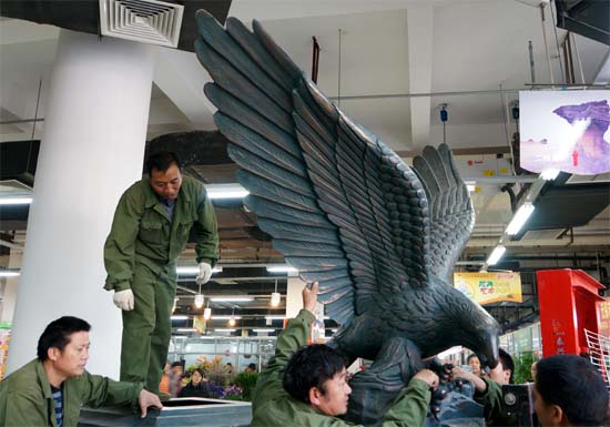 “大鹏一朝乘风起,扶摇直上九万里”,近日,一座以雄鹰展翅为题材的青铜雕塑落户完美入口文化工艺品市场。