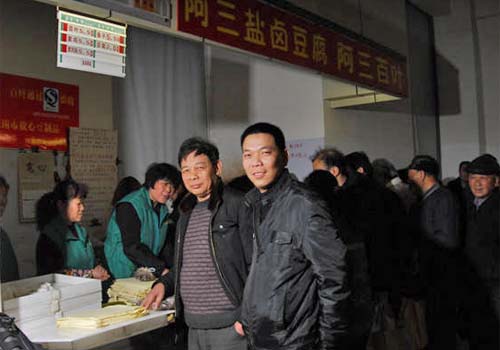 在无锡吃到百叶,不能不提:阿三。阿三就是卖百叶老板贺三南的小名,现年59岁,摊位位于朝阳菜场二楼东侧,豆制品专区。20来年前,这位来自无锡长安堰桥镇王家庄村的阿三,以靠着出担八条绳,挑着自己做的百叶豆腐走街穿巷叫卖为生。如今,阿三的祖传的百叶事业已经传到儿子贺高阳的手里,“阿三百叶”也已经品牌注册了,成为无锡市放心豆制品。在这里,阿三百叶阿三盐卤豆腐的牌子很响,你要想吃到这里的百叶和豆腐,不仅要排队,还必须乘早排。这里的排队也很夸张,基本上就是从开张一直排队到百叶豆腐卖光为止,从不间断。