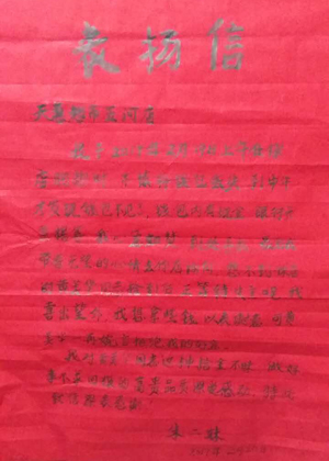 我对黄美华同志这种拾金不昧、做好事不求回报的高贵品质深受感动,特此致信深表感谢!