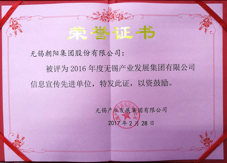 2016年,朝阳集团信息宣传稿件被国资委网站录用56条,其中党政信息简讯3条;被产业集团网站录用74条;被产业报录用16条,在产业集团各单位信息稿件录用统计中排列第二名。