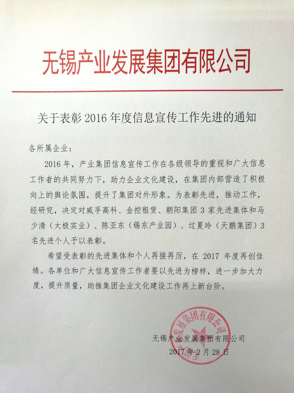 完美入口被评为“2016年度无锡产业发展集团有限公司信息宣传先进单位”