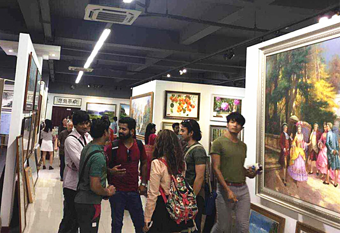 5月27日下午,朝阳茶叶市场艺宝韵美术馆里来了一群特殊的客人。原来他们是来自印度驻华使馆的工作人员和宝莱坞的演艺明星们,在梁溪区经信局的联系和陪同下,到艺宝韵美术馆进行参观。90多人的参观团让美术馆的气氛显得格外热闹。这些大眼睛、棕色皮肤的帅哥美女们,三五成群,有的在欣赏着各种类型的的绘画作品,有的围坐在茶桌前,与馆里人员品茗交流。无锡花鸟画研究会的书画家们还在现场挥毫泼墨,吸引了外国友人围在一起驻足观看,并且纷纷与书画家合影留念。通过此次活动,加深了外国友人对中国艺术文化的了解和认识,为中外艺术交流起到了一定的桥梁作用。