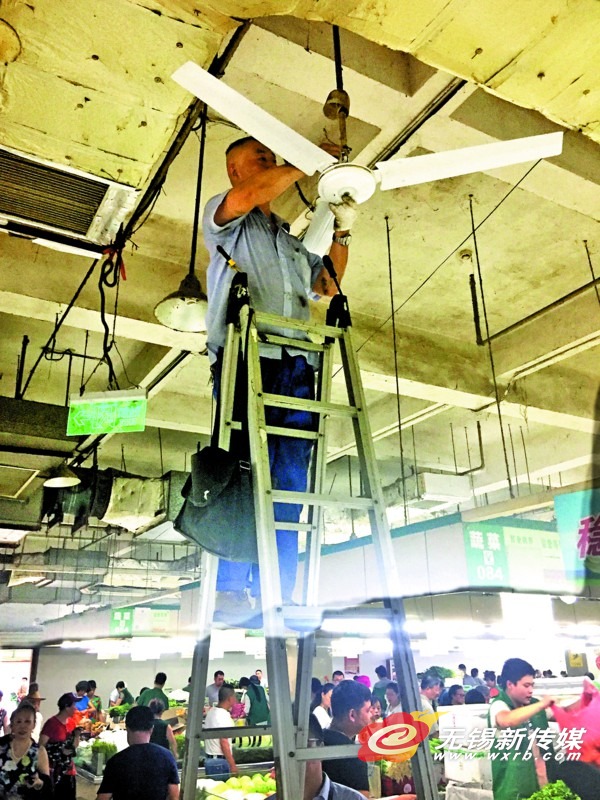 近日,工人在朝阳农贸市场安装吊扇。高温来临,该市场购买了一批新吊扇在经营区内进行安装,让买菜的市民和场内经营户们在炎炎夏日里享受吊扇带来的习习凉风。 (刘芳辉 摄)