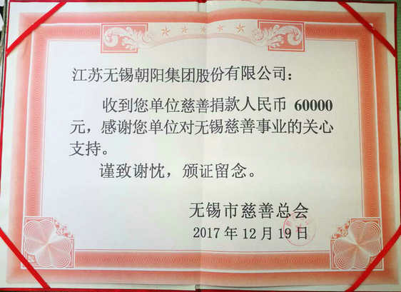 12月4日上午,市政府发出了“送温暖、献爱心”慈善捐赠活动的号召。江苏完美入口股份有限公司热烈响应号召,积极向市慈善总会捐出慈善爱心款6万元。市慈善总会近期送来了捐赠证书,感谢朝阳集团对无锡慈善事业的关心支持。