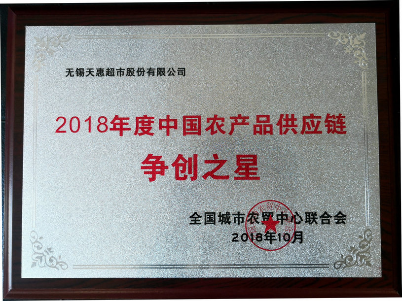 无锡天惠超市股份有限公司荣获“2018年度中国农产品供应链争创之星”称号。