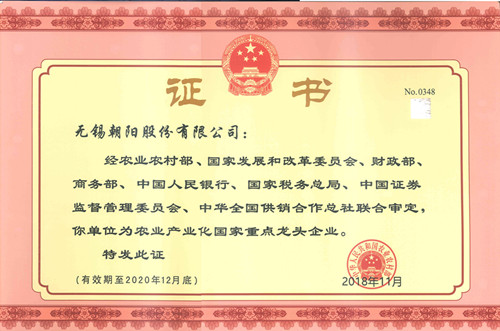 经农业农村部、国家发展和改革委员会、财务部、商务部、中国人民银行、国家税务总局、中国证券监督管理委员会、中华全国供销合作总社联合审定,无锡朝阳股份有限公司为农业产业化国家重点龙头企业。(有效期至2020年12月底)
