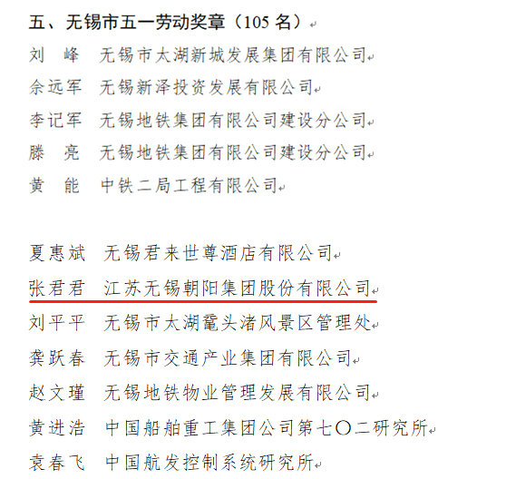 朝阳集团董事长张君君荣获“无锡市五一劳动奖章”称号