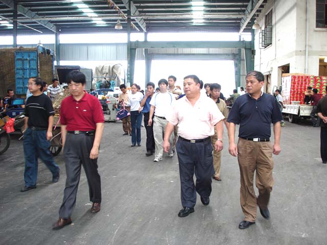 华中客人们实地参观了锡澄市场2.5万平方米的现代化交易大厅,先进的电子磅秤结算系统和监控系统。并听取了朝阳股份公司吴书记关于朝阳股份经营、管理、发展和分配机制等方面的详细介绍。客人们对朝阳股份公司近年来通过转观念、创新路、求发展所取得的优异业绩作出了高度评价。