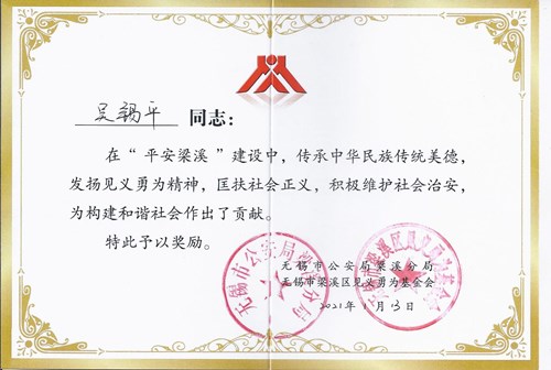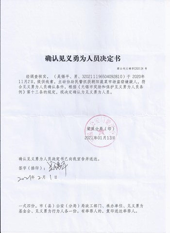 近日,无锡朝阳股份有限公司蔬菜保卫科科长吴锡平收到来自无锡市公安局梁溪分局的《确认见义勇为人员决定书》和奖励证书。