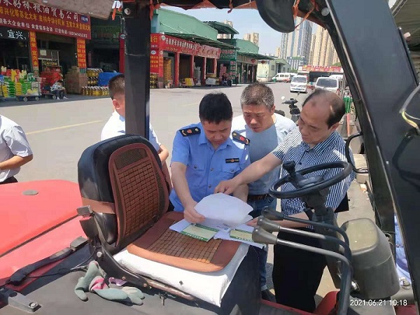 徐总向检查人员详细介绍市场的发展及日常管理工作,检查人员针对市场客商所售商品以及索票索证工作进行了解,并当场验证;对市场特种设备叉车台账、叉车的安全装置现场查验。