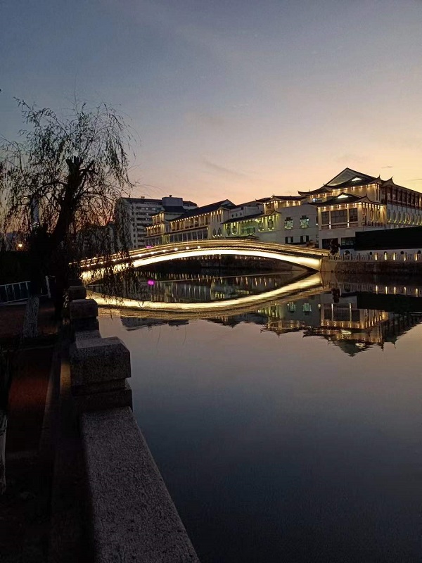 | 号外!号外!号外!就在刚才历时6个月工期的羊腰湾桥举行了隆重的开桥仪式。 该羊腰湾慢行桥通行后不仅缩短了羊腰湾路附近的居民来朝阳农贸市场、工艺品市场、鱼鸟宠物市场采购游玩的路程、缓解了槐古路的交通压力,而且为古运河上增添了一个靓丽的风景。 羊腰湾慢行桥横跨古运河,西侧为槐古路,东侧为羊腰湾路。宽度40.8米,西侧驳岸标高为3.0米。东侧驳岸标高3.8米左右,该段古运河为旅游航道,最高通航水位2.5米,通航宽度12米,通航净高2.5米。总投资2285.5万元。 傍晚的羊腰湾桥亮化灯开启后,加上工艺品市场古色古香的复古外观造型也是古运河上的一道风景。(朱亮)