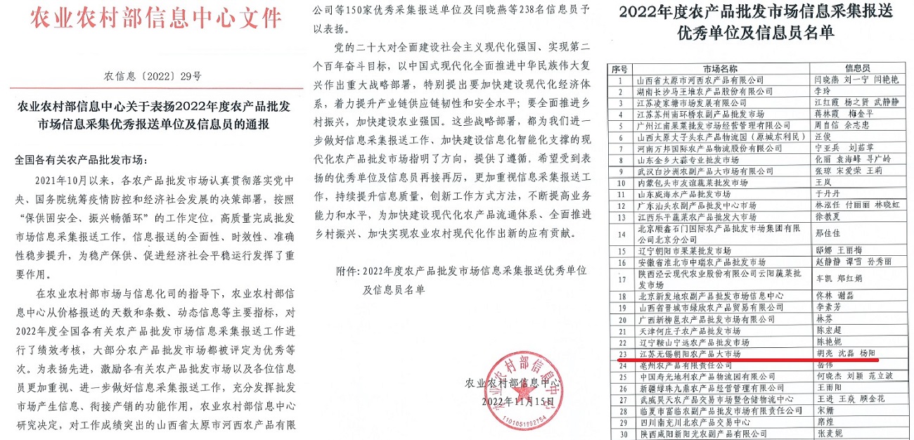 近日,集团收到农业农村部关于表扬2022年度农产品批发市场信息采集优秀报送单位及信息员的通报及感谢信,对工作成绩突出的无锡朝阳农产品大市场及杨阳、胡亮、沈磊等3名信息员予以表扬。