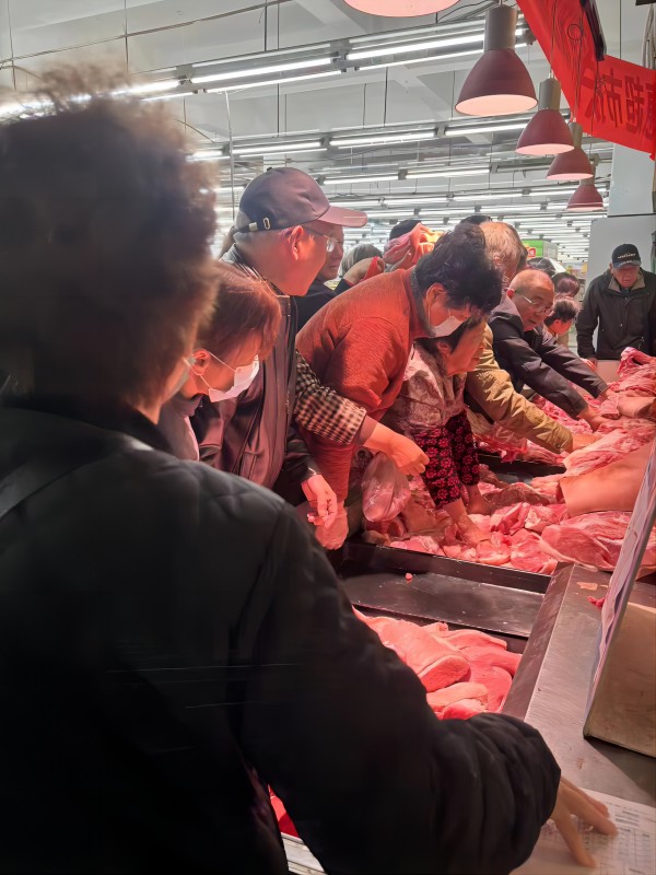 清明小长假期间,天惠超市五河店迎来了大批前来购买猪肉的顾客。为了满足消费者的需求,超市提前做好了充足的准备,所有员工比平时早10分钟到岗,确保在早市开始前各项工作准备就绪。