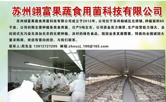 苏州翊富果蔬食用菌科技有限公司成立于2012年,公司位于苏州相城区北桥镇,种植面积60于亩,公司初期主要种植各类食用菌,日产5吨左右,公司资金实力雄厚,生产经营能力强大,全封闭式无污染无添加无农药化肥种植,决对的绿色食品。现因业务发展需要,特面向全国诚招大量求购商。欢迎有意向的您,与我们联系。联系人:周先生 13912721205 邮箱:zhouzj_100@ |